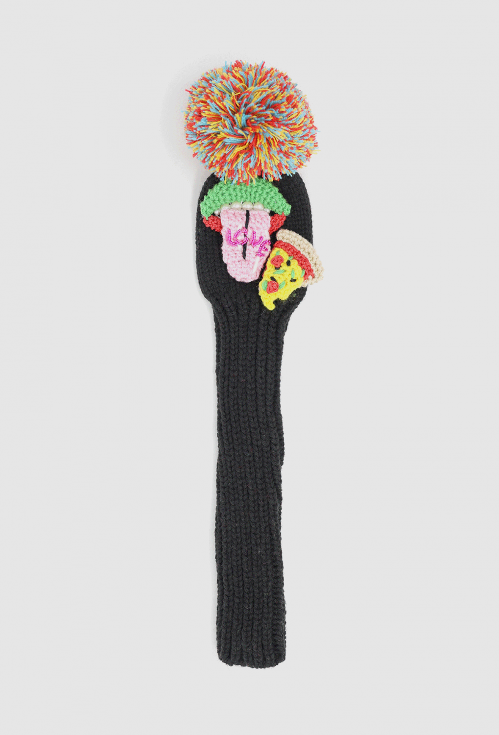 編みぐるみのRIPとピザが付いた、ニット製のフェアウェイウッド用ヘッドカバーです。