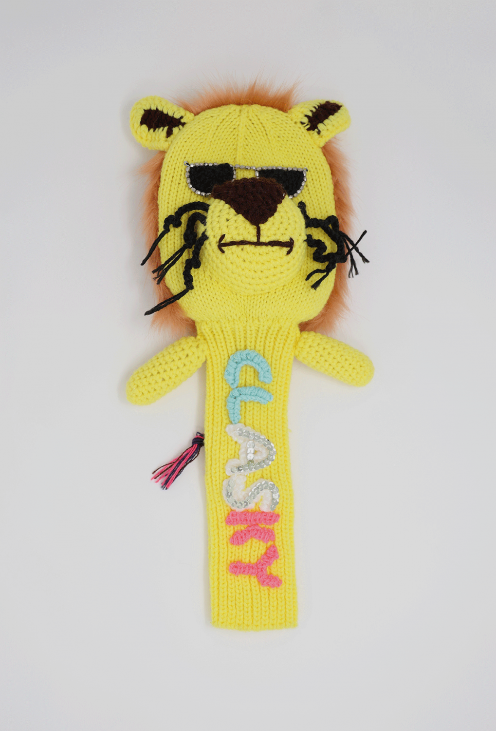 イタリアンカラーの「CLASKY」ロゴ入りライオンの編みぐるみ付きドライバー用ヘッドカバー。